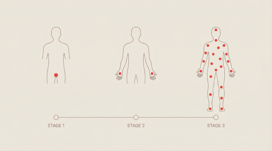 一期梅毒:硬下疳感染后2-4周出现。生殖器部位出现无痛性、硬结节状溃疡,表面清洁,像软骨一样硬。即使不治疗,也会在3-8周内自行消退,但这绝不意味着痊愈。 二期梅毒:全身播散