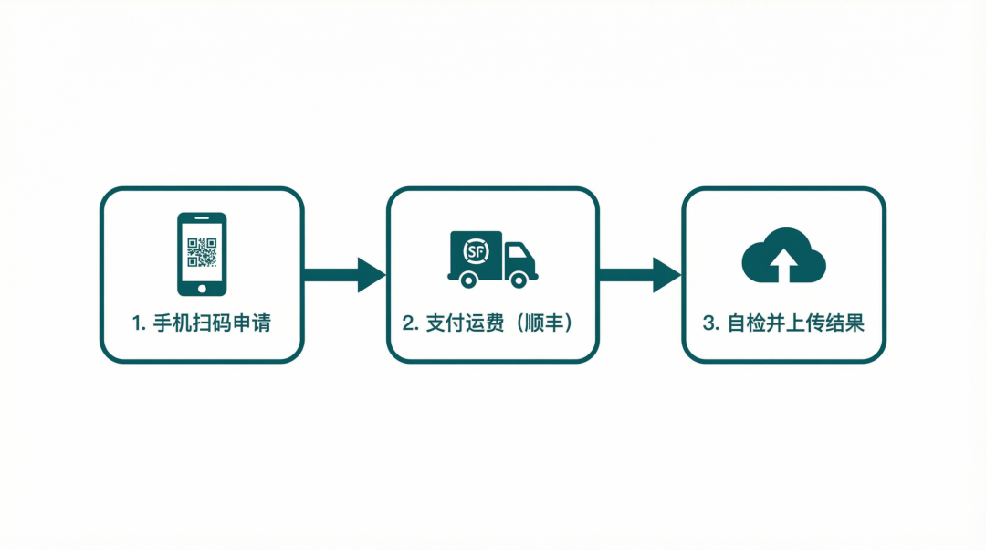 依托“爱加易”微信小程序,只需一部手机,几分钟即可完成申请。手机扫码下单,支付顺丰运费,坐等健康卫士上门。